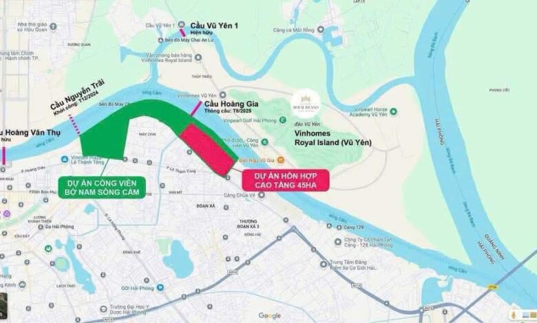 Khu đất 165ha bờ Nam Sông Cấm từ cầu Nguyễn Trãi tới cuối đường Lê Thánh Tông sẽ triển khai công viên bờ Nam Sông Cấm rộng 120ha với điểm nhấn là dự án bất động sản cao tầng rộng 45ha